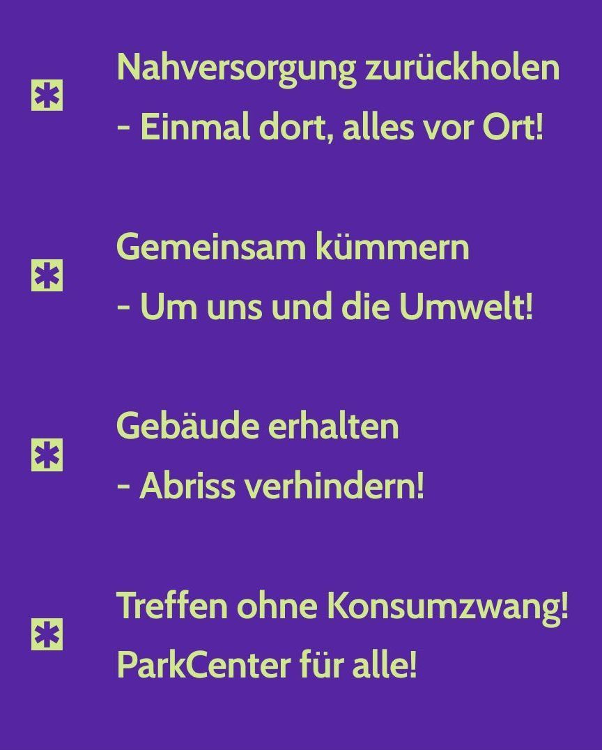 Das wäre nicht nur ein ökologischer sondern auch ein riesiger sozialer Fehler. Was wir brauchen sind eine wohnortnahe Versorgung und nachbarschaftliche Treffpunkte. Wir wollen deshalb, dass das ParkCenter erhalten bleibt und mit Angeboten gefüllt wird, die tatsächlich auf die Bedürfnisse der Anwohner*innen antworten. Die ehemalige Shoppingmall in Treptow soll zum Sorgezentrum werden!